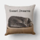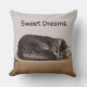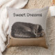 Graue Tischkatze, die auf einem Karton schlief, wirft Kissen im Wohnzimmer. Schönes, gemütliches Katzenfoto digital gestrichen. Personalisiert für Katzenliebhaber. Phrase 'Sweet Dreams' auf beiden Seiten. Stellen Sie Ihren Namen oder Satz nach Schriftart, Stil, Größe oder Farbe ein. Entfernen Sie Text, falls gewünscht. Bildrecht Marg Seregelyi Fotografie.