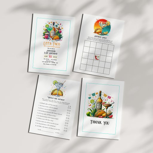 Add a fun and interactive activity to your celebration with this “Tacos & Tequila” Would She Rather party game. Featuring a festive margarita and taco illustration with colorful confetti details, this game is perfect for birthday parties, fiesta themes, or girls’ night celebrations. Guests will enjoy guessing the guest of honor’s preferences, making it a lively and engaging icebreaker. Ideal for Mexican-themed parties, summer celebrations, and vibrant social events, this game pairs perfectly with matching invitations and party décor for a cohesive look.