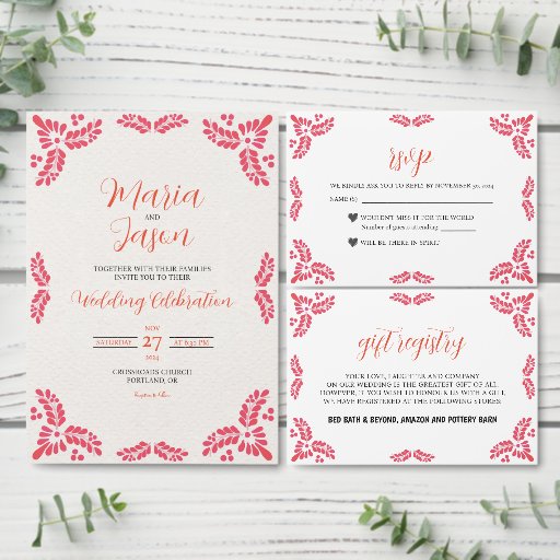 This Talavera Orange Floral Minimalist Spanish Wedding Save the Date design features a minimalist approach with delicate, symmetrical orange floral motifs placed in each corner and along the edges. The small, leaf-like shapes create a sense of movement while maintaining an airy, open space in the center, allowing for ample text placement. The simplicity and elegance of the pattern evoke traditional Talavera tiles, giving the design a classic Mexican artisanal feel.