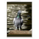 Häusliche Taube mit Sonnenschein auf einem Felsen neben einem Teich.
