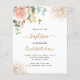 Weiß mit Eukalyptusgrün dekoriert, Rose gold und rot rosa Rose, goldene Blätter und Imitate goldener Glitzer fällt. Personalisieren und die Kinder Name und Zeremonie Details. Schwarze und goldfarbene Buchstaben. Zurück: weißer Hintergrund mit goldenen Imitaten Glitzer fällt ab