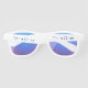 Diese Sonnenbrille wird in einem niedlichen massiven, weißen Farbdesign mit blauen Spiegellinsen gezeigt. Text liest Team Cheer. Passen Sie diesen Artikel an und ändern Sie den Text zu Ihrem oder kaufen Sie, wie es ist.
