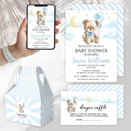 Tauchen Sie ein in den himmlischen Charme mit unserer Aquarellblau-goldenen Babydusche-Einladung, die mit einem zauberhaften, fliegenden Teddy-Bären, der in zimmerndem Mond und Sternen Luftballons hält, aufwartet. Diese bezaubernde Einladung Set den perfekten Ton für Ihre himmlische Feier und verbindet Laune mit Eleganz für ein unvergessliches Ereignis.