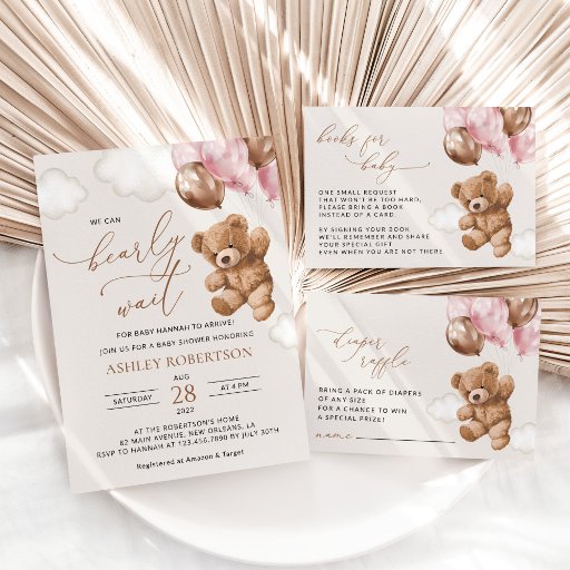 Fügen Sie Ihrer Babydusche mit diesen stilvollen und unvergesslichen Party eine persönliche Touch hinzu! Die Einrichtung besteht aus einem Teddybär mit rosa Ballons auf beigem Hintergrund.