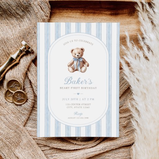 Grandmillennial Teddy Bär Geburtstagsfeier Einladung für jedes Alter, mit klassischen blauen Streifen und einem Vintagen Teddy Bär