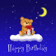 Ein niedlicher Teddybär mit einer Geschenkboxen sitzt auf einer Wolke vor einem blauen Nachthimmel mit hellen Sternen und Mond.