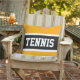 Dieses unterhaltsame Sportdesign zeichnet sich durch klassisch starke, fette Großbuchstaben in einem markierten, breiten schwarzen Streifen mit weißen pinstripes auf hellgelbem Hintergrund aus, wobei "TENNIS" sich vor und in der Mitte ausdrückt. Die Farben und Texte in diesem Design können personalisiert sein.