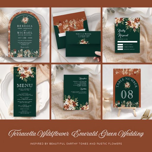 Terracotta Floral Wildblume Emerald Green Wedding Menükarte