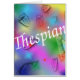 " Thespian"… wissen Sie, dass was es… bedeutet, tun sie? Diese Karte kennzeichnet einen Regenbogen farbigen Hintergrund mit Komödien- und Tragödiemasken.