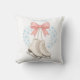 Pretty throw pillow with ice skates and a big pink bow surrounded by snowflakes in the shape of a heart front and back, add a thoughtfully personal message and name for gifting to someone special that enjoys ice skating this winter.