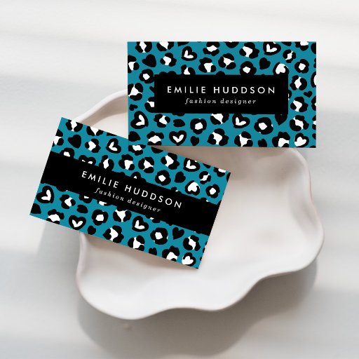 Elegante, stilvolle und raffinierte Visitenkarten mit Leoparden Flecken und Herzen in Blau und Schwarz. Modernes und trendiges Design, perfekt geeignet für Tierdruckliebhaber.
