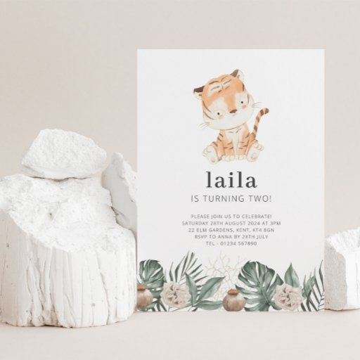 Ein süßer Aquarelltiger mit Dschungel-Blätter und neutralen Blume. Ideal für Ihre Geburtstagsparty zum Thema Tiger!