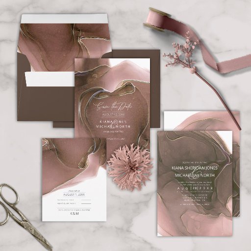 Ein abstrakter Hintergrund, der an eine flüssige Tinte in den Tönen von Tieftaupe bis Rosa und Weiß erinnert, bildet den Hintergrund für elegante handgeschriebene Skripttexte und moderne Designs in den Teilen dieser wunderschönen Hochzeitssuite. Der hier gezeigte Hochzeitsplaner weist den obigen Hintergrund mit einem Label auf, das Ihren Namen und einen Titel für Ihr Buch enthält. Durchsuchen Sie ID762 um alle Koordinaten in diesem Set zu sehen.