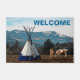 Eine Szene aus der Pazifikregion Nordwesten der Vereinigten Staaten mit einem Bild eines Indianers und seines Pferdes in der Nähe eines Tipis. Schnee hat sich auf den höheren Hängen der Berge im Hintergrund niedergelassen. Anpassbare Textauswertung, "WELCOME" erscheint ebenfalls.