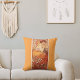 Ein Kissen mit der Modedarstellung Topaz von Alphonse Mucha (1860-1939) ist ein Beispiel für die Jugendstil-Bewegung. Das Bild zeigt eine junge weibliche Figur mit dekorativen gemusterten Hintergründen in Orangetönen und Touchs der Natur. Die weibliche Figur blickt direkt auf den Betrachter mit einem entspannten, eleganten Ausdruck.