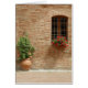 Hölzernes gewölbtes Fenster-Set in einer toskanischen Wand des roten Ziegelsteines mit Blumen am Fenster und an einem Töpferwaretopf auf dem Hof unten