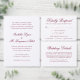 Die Einladungs-Suite ist komfortabel und preisgünstig. Sie ist alle in einer Hochzeitseinladung mit beiliegender rsvp-Karte und Umschließungskarte ausgestattet. Die Einladung zur Hochzeit zeichnet sich durch ein einfaches Design mit den Namen der Braut und des Bräutigams in eleganter Kalligraphie und traditioneller Formulierung aus. Die Vorlage hat Felder für zwei Gastgeber aufgelistet werden, sodass es ideal, wenn die Eltern der Braut nicht mehr verheiratet sind und beide Gastgeber der Hochzeit sind. Auf der UAWG-Postkarte befindet sich Ihre Postanschrift auf der Rückseite und Ihre Gäste werden abgeschnitten und per E-Mail an Sie zurückgeschickt. HINWEIS: Für die UAWG-Postkarte ist ein erstklassiges Porto erforderlich. Postkarten-Briefmarke sind aufgrund der Größe nicht ausreichend. Der gesamte Text ist bordeauxfarben über einem weißen Hintergrund und kann durch Anklicken des Buttons "Anpassen" in eine beliebige Farbe geändert werden. Ein klassisches Design, das perfekt für eine formelle Hochzeit ist.