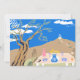 Original hand drawn illustration of Mediterranean afternoon with wine and coffee scenery, travel keepsake decor for backpackers. travelers and slow living lovers. Homely scenery with table set under an olive tree with a small chapel on a hill in the background on a sunny day with blue sky. Great as a kitchen decor.