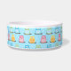 Niedliche Hundefutterschale mit niedlichen bunten Eulen und einem Hundeknochen mit dem Namen Ihres Hundes im Knochen.