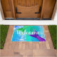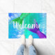 Helle aquamarine und lila Meerjungfrau Schwänze und Schuppen Türmatte mit dem Wort "Willkommen" in der weißen Schrift. Fügen Sie Ihrem Eintritt etwas Stil und Spaß mit dieser kühnen Meerjungfrau-Tür hinzu.