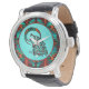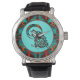 Dies ist eine einzigartige "One of a Kind" Tribal Wolf Watch! Es hat einen Südweststamm Wolf Howling am Mond auf einem türkisfarbenen Hintergrund ...umgeben von einer türkisfarbenen, orangen und schwarzen Grenze! Original Art Design von Künstler Kerry Miller.