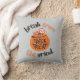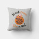 Ein Kissen mit der Phrase "Break from the Grind" in fetten Briefen, begleitet von einer Grafik eines Halloween-Kürbchens, der mit Leckereien überflutet ist, und symbolisiert eine süße und festliche Flucht aus dem Alltag.