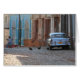 Ein klassisches Auto und ein paar Hühner in einer Kopfsteinpflasterstraße in Kuba