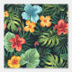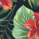 A colorful, illustrated floral pattern with bright monstera leaves and vibrant, tropical red, orange, and blue flowers on a dark background.