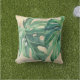 Eleganter Outdoor-Möbeldekorator Kissen zwei große grüne tropische Blätter/Monstera auf einem goldenen Sandboden.