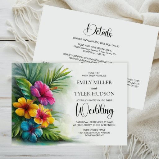 A tropical hibiscus wedding RSVP response card to include with your invitation for your guests to confirm their attendance on your special day.