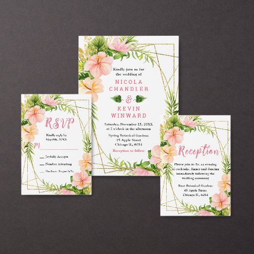 This fun and whimsical wedding rsvp enclosure card features watercolor pink and orange hibiscus flowers, monstera leaves and foliage on a gold geometric frame. The text combines handwritten script and serif fonts for a stylish and modern look. This is perfect for a spring or summer rustic wedding.