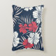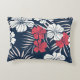 Pink and white flower bloom against a navy blue background on this tropical floral abstract print.