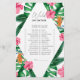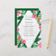 Tropical Palms Watercolor Bridal Dusche Einladung. Das Design besticht durch ein elegantes Bouquet mit klassischen Strandfarben und Blume, darunter rosafarbener Hibiskus, orangefarbene und blaue Paradiesvögel, grüne Vegetation und dunkelgrünes Palmenblatt.