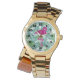 Eine Armbanduhr mit einem grünen tropischen Blätter und eine rosa Flamingo-Illustration überlagert eine Touch von Lustigkeit.
