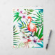 Ein tropisches Design-Kunstwerk aus einem rosa Flamingo und grünen tropischen Dschungel-Pflanze mit Hibiskus Blume und Palmen vor einem neutralen weißen Hintergrund. Ein lustiges und farbenfrohes Kunstwerk.