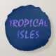 Die Bildsprache des Fotos, die Mosaikgrafik, mit den Worten "Tropische Inseln", die in exotischen Inselmustern dargestellt werden; Fuschia, Rot, Türkis, Blau, Gelb, Weiß und Schwarz.