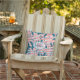 Tropisch aquamarine blaue Palmen auf blasskorallen, gelben und babyblauen Streifen, bereit für Ihren Namen und Monogramm in schicken Schriftzeichen in jeder Farbe auf transparenten weißen Overlay auf der Vorderseite (kann gelöscht oder verschoben werden). Schaffen Sie sich selbst oder geben Sie als Geschenk. Wählen Sie Outdoor oder INDOOR Stoff und aus 3 Größen.