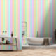 Die Tapeten mit tropischem Streifen sind in coolen Blau- und Grüntönen gehalten, die warmen Farben Rosa, Gelb, Orange und lila. Es ist hell und gemütlich, wie Markisen und Sonnenschirme, die in warmer Sonne leuchten.