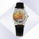 Eine stilvolle Frauenuhr mit schwarzen Ziffern, die ein Foto der orangefarbenen Blume des tropischen Vogels von Paradise Pflanze, auch bekannt als Crane-Blume, zeigt. Ein schönes, blumengeschmücktes Design!