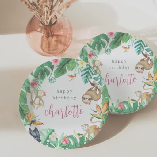 Set die Szene für die sommerliche tropische Dschungelgeburtstagsfeier mit diesen bunten personalisierten Tellern. Das schicke Design der Insel umfasst Monstera-Blätter und grünes Aquarell mit Affen, Faultier, Kolibri und Papagei. Farbenfrohe tropische Blumenakzente runden das Design ab. Personalisieren Sie mit dem Namen Ihres Kindes in lebhaften rosa Schriftzeichen, zusammen mit dem Party-Anlass.