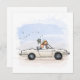 Uitnodigingskaart bruiloft met unieke illustratie van bruidspaar in een witte Fiat 850 Spider in een mediterrane sfeer