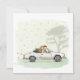 Uitnodigingskaart bruiloft met unieke illustratie van bruidspaar in een witte Karmann Ghia in een mediterrane sfeer