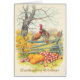 Ein idyllischer Herbsttag auf dem Bauernhof. Dieser Vintage Erntedank zeigt zwei Truthühner auf einem Zaun. Eine Scheune im Hintergrund. Erntedank Ernte im Vordergrund.