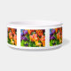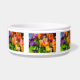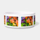 Farbenfrohe violette, lila, rosa Tulpen auf einem Blumenbett. Fast alle Regenbogenfarben sind vorhanden. Helle und positive Blumenszene. Haustiernapf.