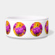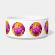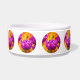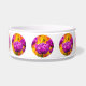 Farbenfrohe violette, lila, rosa Tulpen auf einem Blumenbett. Fast alle Regenbogenfarben sind vorhanden. Helle und positive Blumenszene. Haustiernapf.
