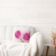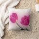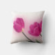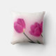 Dieses ist ein weißes Wurfskissen, das mit einer Fotografie einiger rosa Tulpen verziert wird.