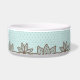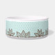 Weiße Keramikhundenahrung/Wasserschüssel, mit Grafiken eines braunen kleinen Polkapunktmusters auf Ei-Blauhintergrund eines Rotkehlchens. Grafiken eines braunen Lacey Entwurfs läuft entlang die Unterseite des Darms. Personifizieren Sie den braunen Text für Ihr Haustier oder als große Geschenkidee für jeden möglichen Haustierinhaber.