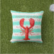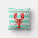 Dekorieren Sie Ihr Zuhause- oder Strandhaus mit einem klassischen Wasserkissen. Türkisblaue, pastellfarbene und weiße horizontale Streifen. Auf der Vorderseite: Ein roter Hummer als Dekor.auf dem Text: Happy Summer. Kleinerer Text 1: Beach House, Ferien, Ozean, Strand, Familie. Kleinerer Text 2: Lazy days, travel. Kleinerer Text 3: Meeresfrüchte, Wein, Spaß, Essen, Lachen, Lächeln Zurück: nur türkis und weiß Streifen