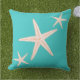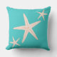 Tropisch türkisfarbenes Strandkissen aus Seestern. Drei helle rosa Seesterne auf jeder Seite von quadratischen, runden oder lumbarförmigen Kissen. Möbel für Innen- und Außendekoration.