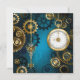 Türkis, strukturiert, Steampunkhintergrund mit Messing- und Goldgetrieben, Silberschlüssel und Uhr. Steampunkstil.